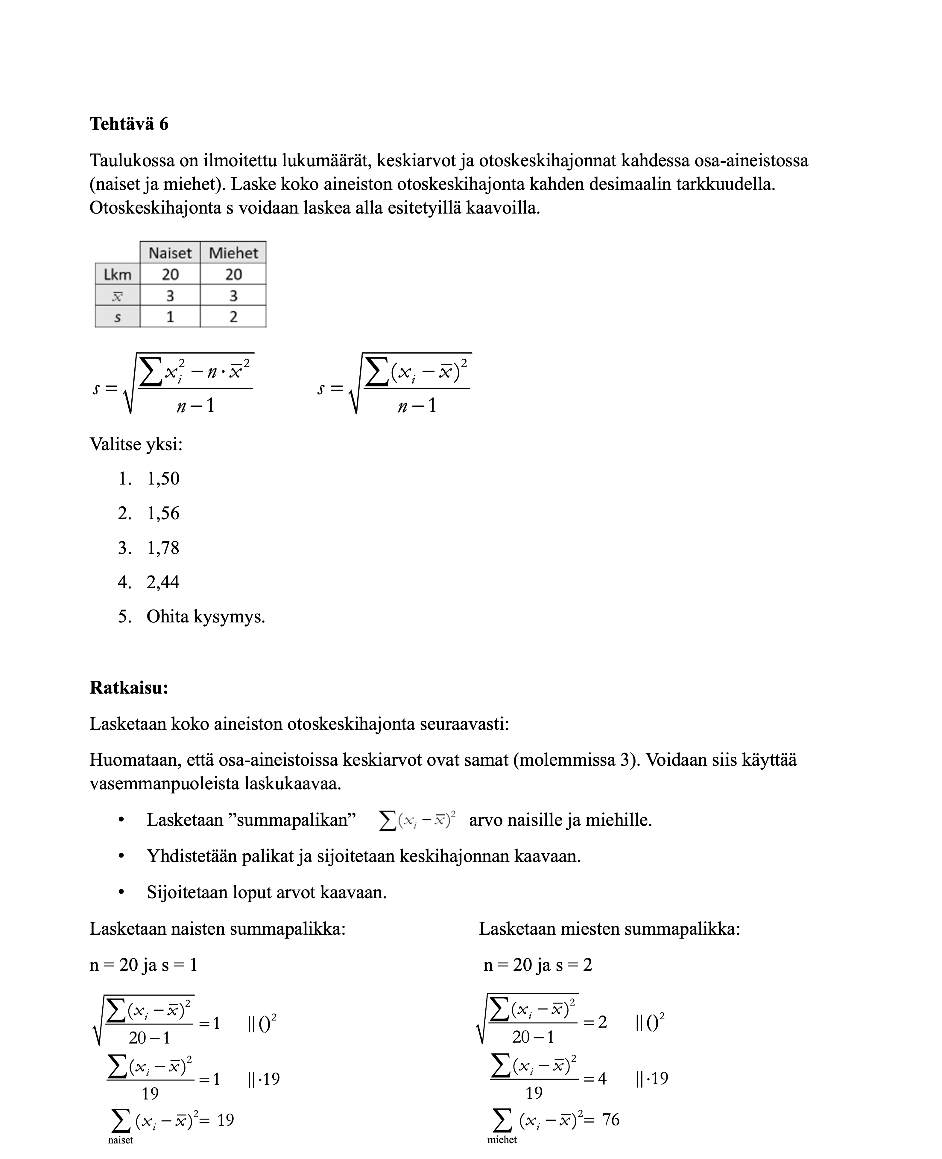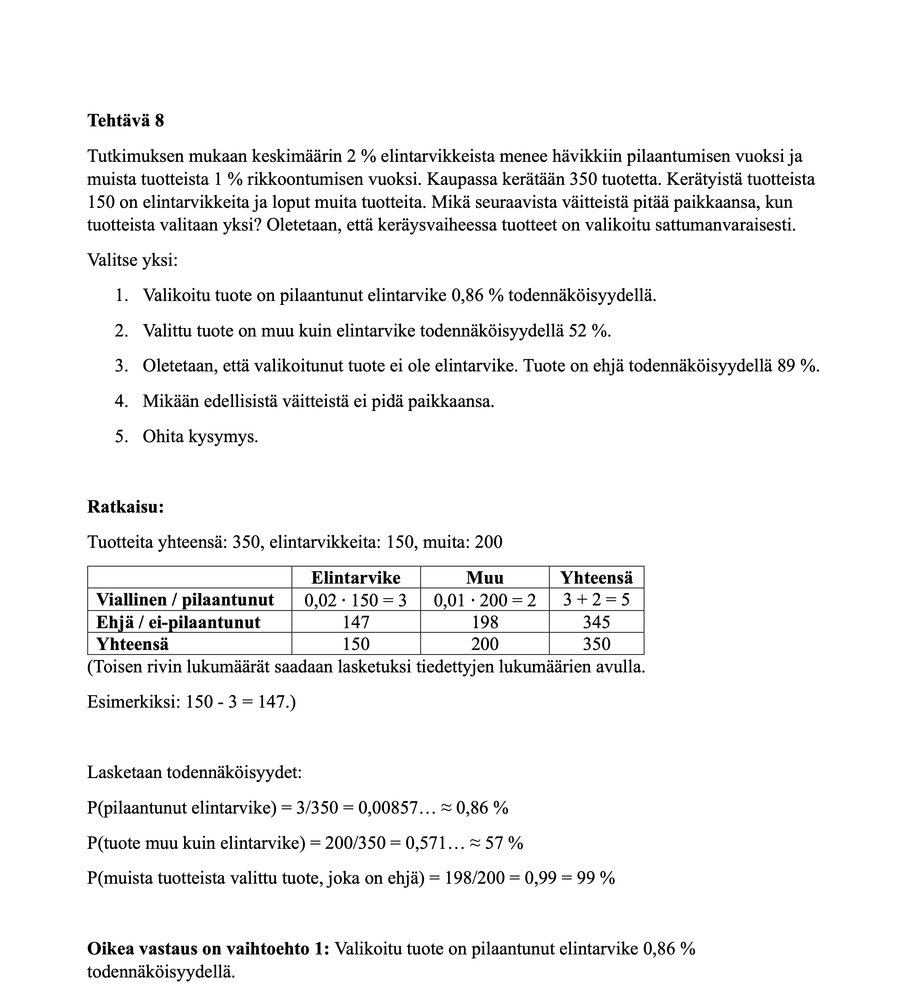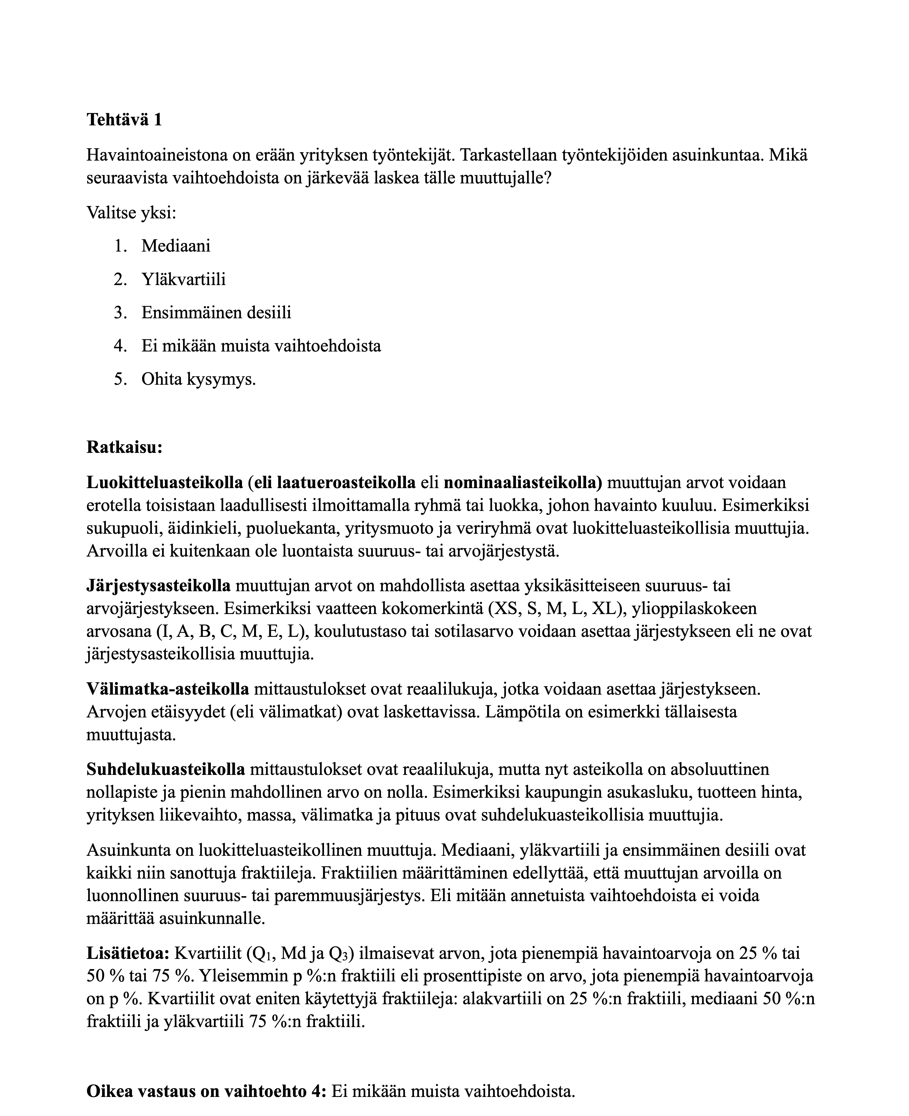 Alta löydät tilastollisten menetelmien harjoitustehtävät. Huomaa, että muutamissa tehtävissä on annettu vaihtoehtoisia ratkaisutapoja, koska tehtävät voi ratkaista useammalla kuin yhdellä tavalla. Ratkaisut kannattaa käydä ajatuksella läpi, koska se edesauttaa asioiden oppimista.