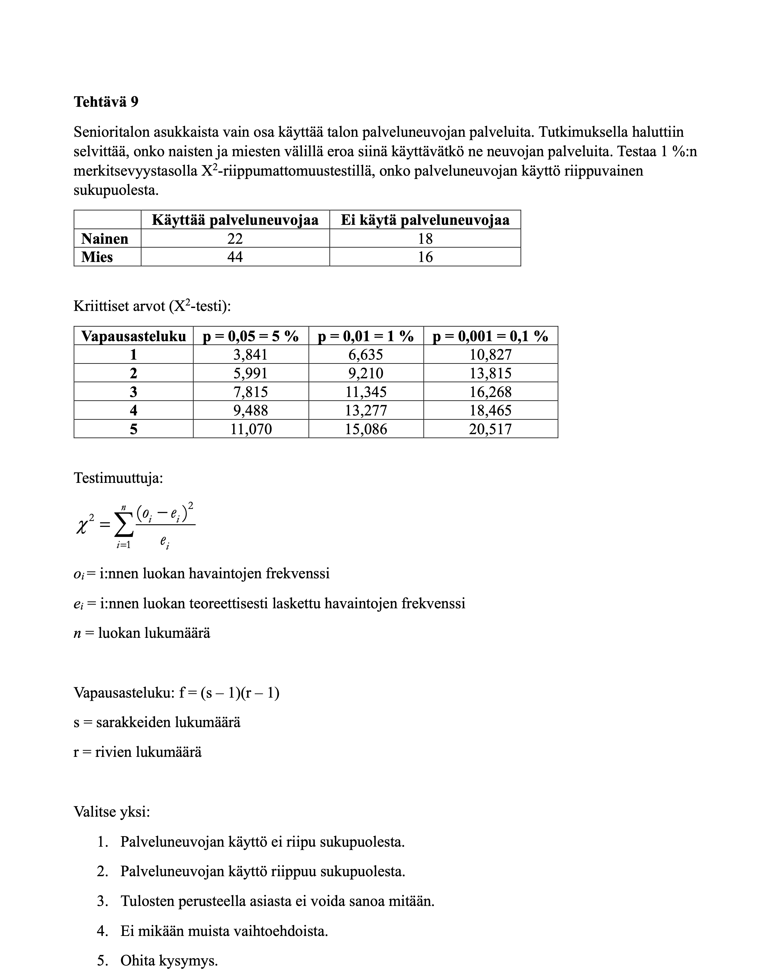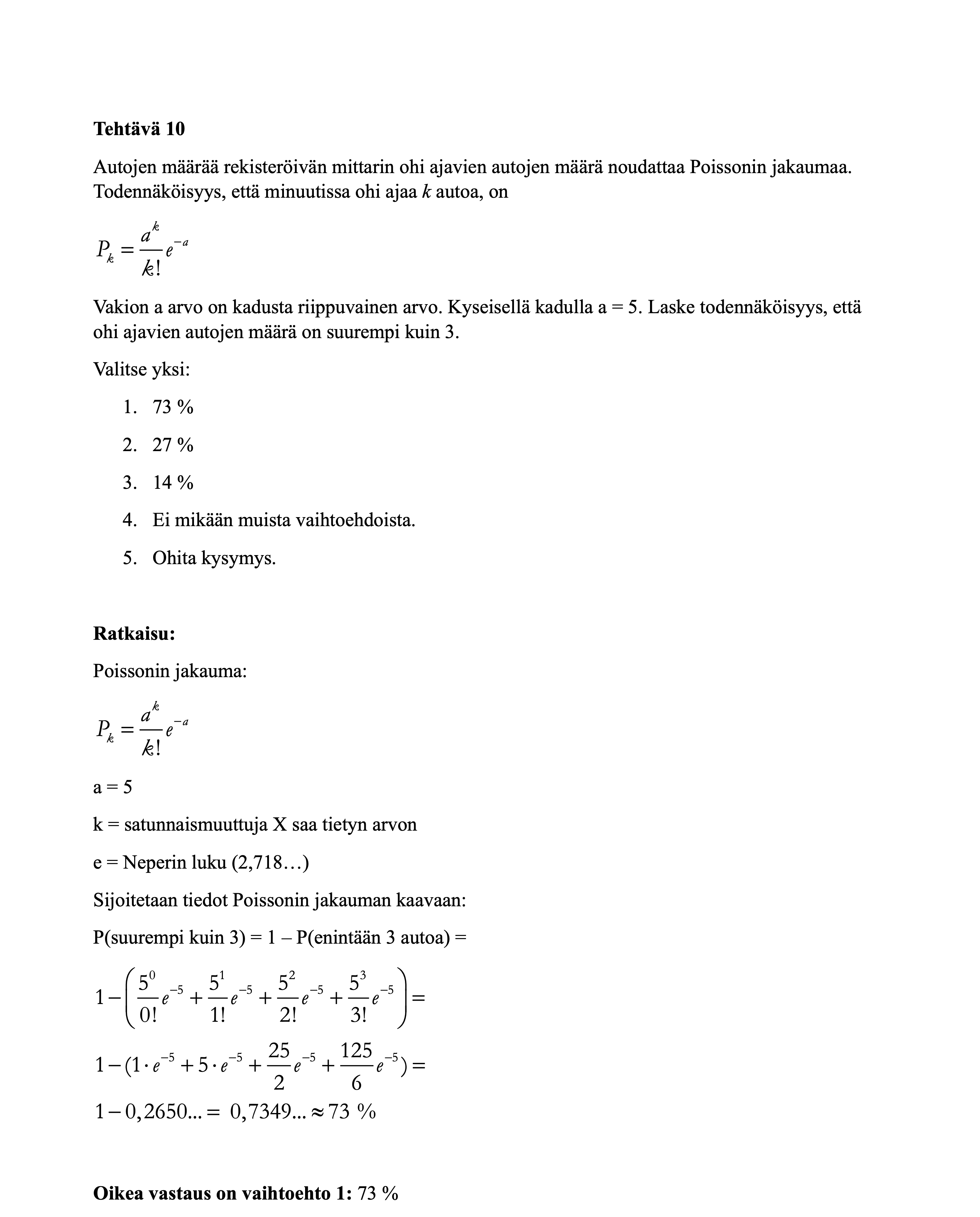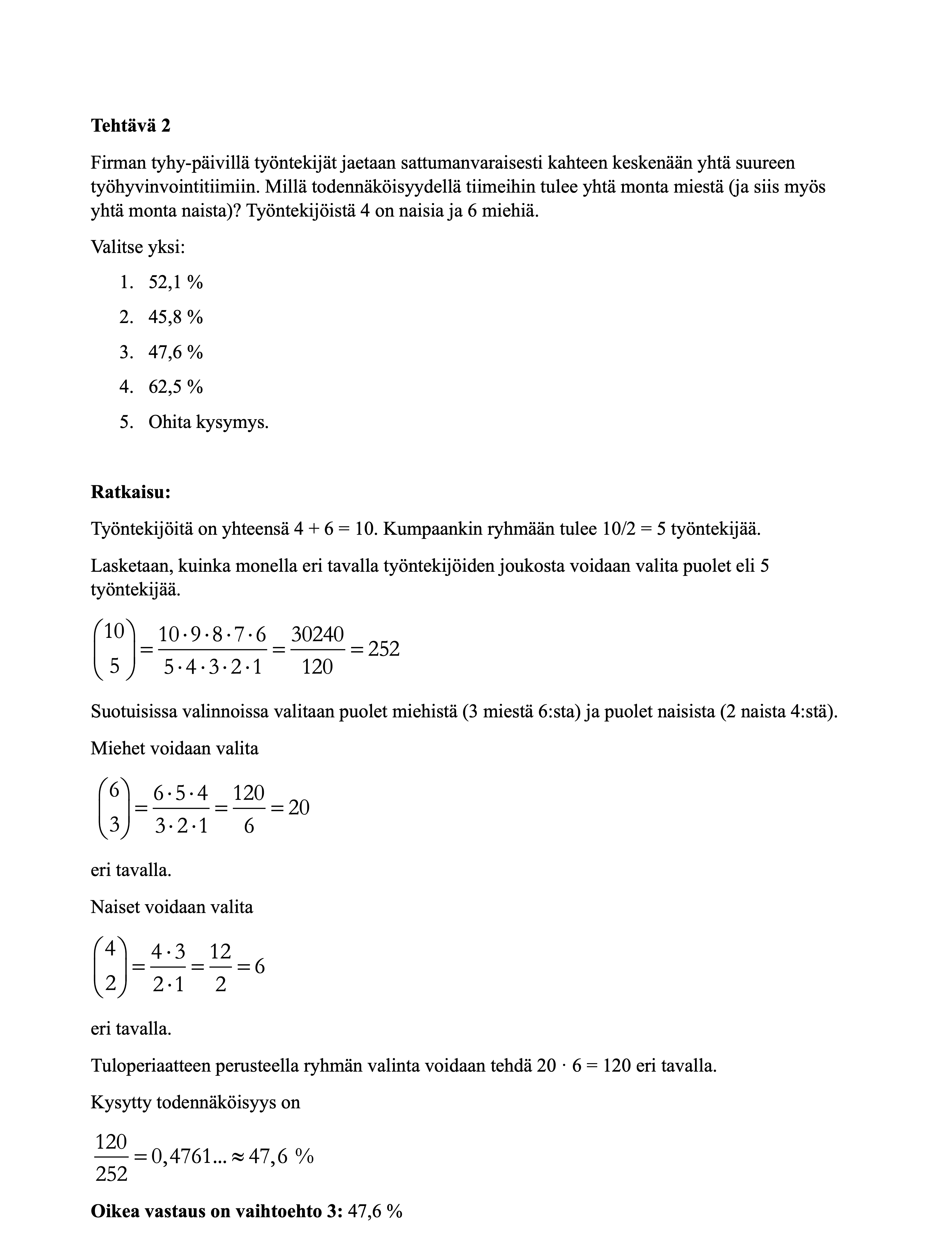 Alta löydät tilastollisten menetelmien harjoitustehtävät. Huomaa, että muutamissa tehtävissä on annettu vaihtoehtoisia ratkaisutapoja, koska tehtävät voi ratkaista useammalla kuin yhdellä tavalla. Ratkaisut kannattaa käydä ajatuksella läpi, koska se edesauttaa asioiden oppimista.