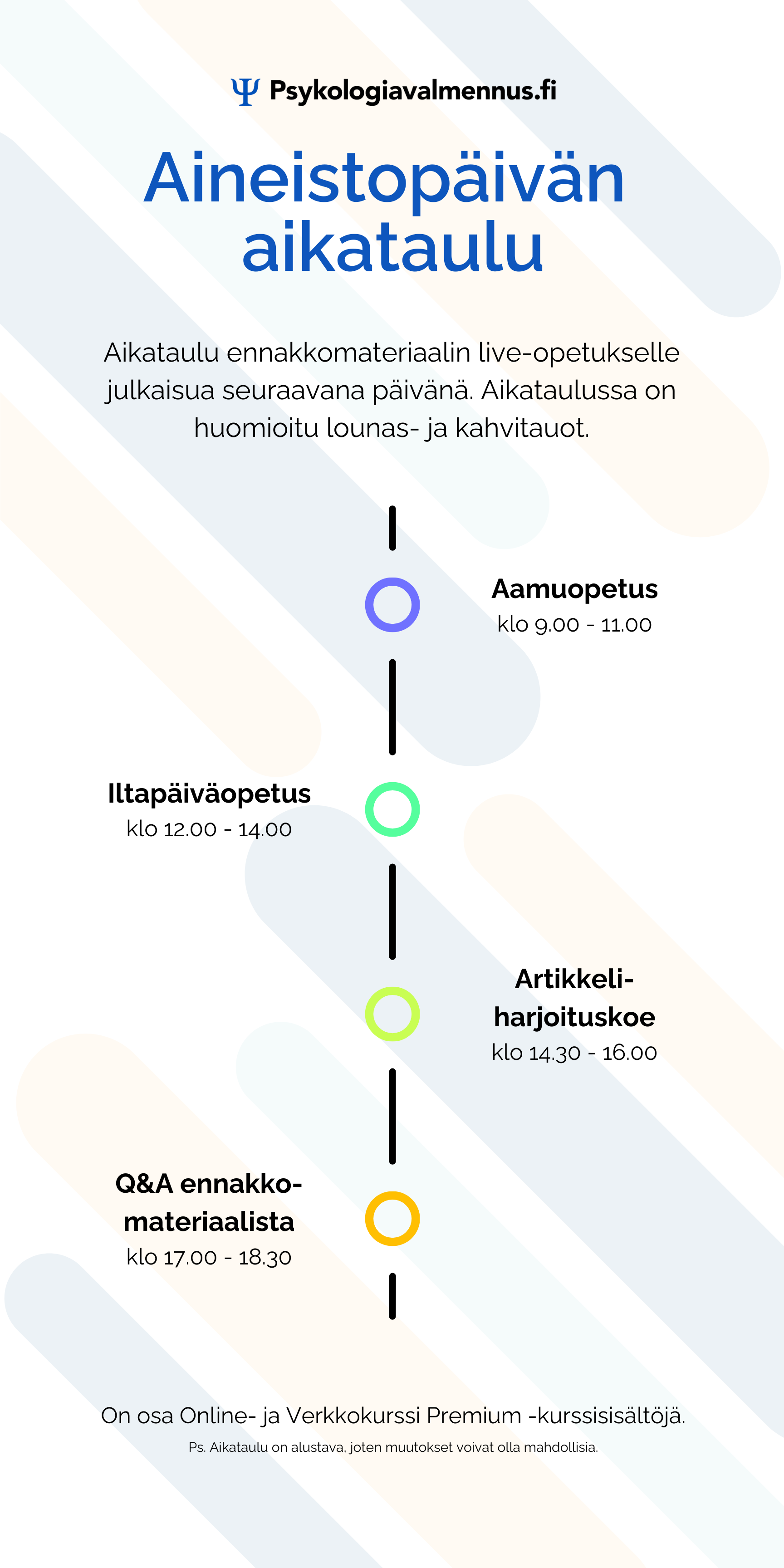 Ainoana kurssijärjestäjänä tarjoamme reaaliaikaisen opetuksen ennakkomateriaalin julkaisua seuraavana päivänä. Alla on aineistopäivän aikataulu.